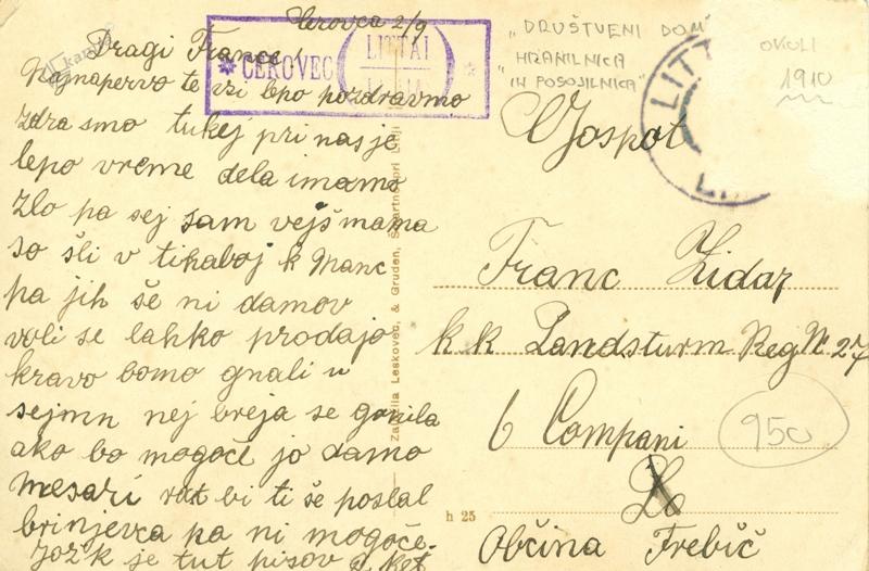 Naslovna stran je razdeljena na dva dela. Na desni strani je napisan naslovnik Franc Zidar, v Občini Trebič. Na levi strani je besedilo sporočila, ki se konča na sprednji strani. Žig odposlanega kraja je Littai, ki je delno poškodovan. Znamka je odstranjena. Ohranjen je žig pravokotne modre barve, besedilo Cerovec Littai-Litija.