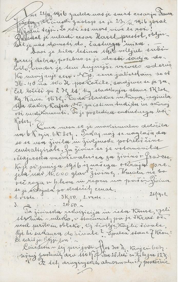 “22.11.1916 zadela nas je smrt cesarja Franca Jožefa Istega dne se je občinski zastop zbral na žalni seji. Prestol je zasedel mladi cesar Karl in obljubil nas dovesti do “častnega” miru.
