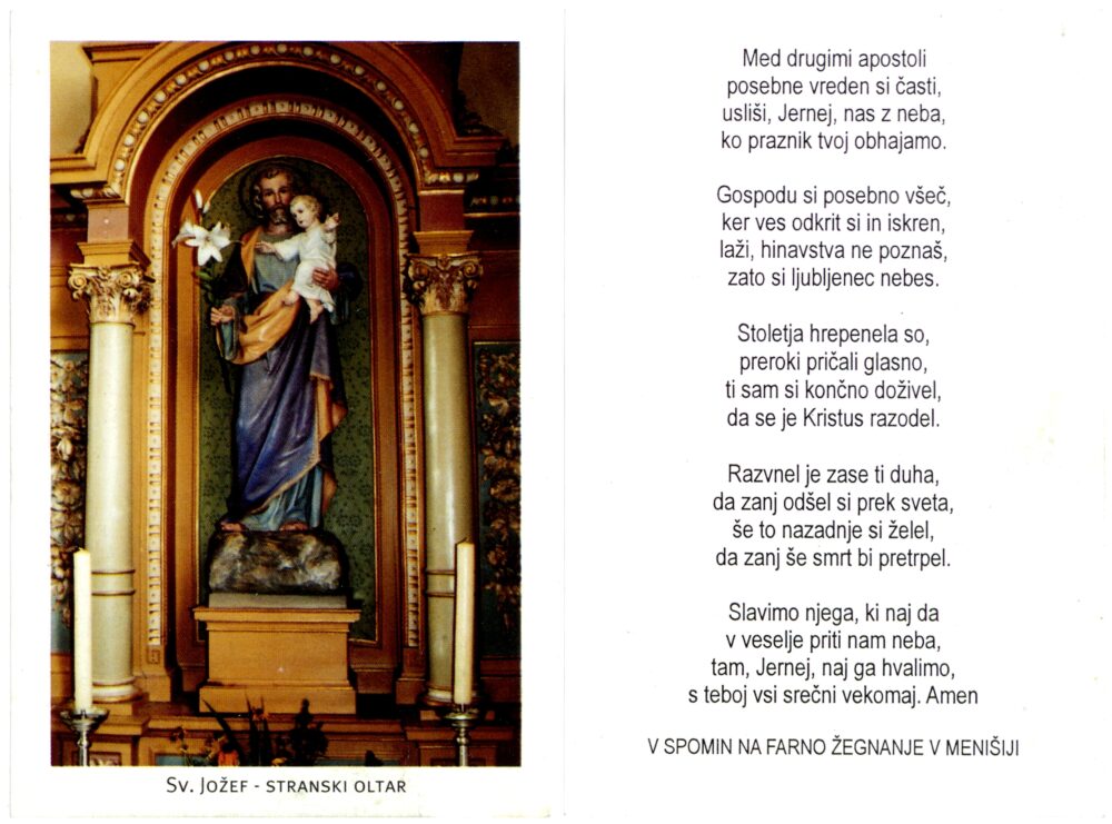 Spomin na farno žegnanje v Begunjah pri Cerknici Multimédiás elem 16.10.2025 22:06 közzétette Knjižnica Jožeta Udoviča Cerknica Spomin na farno žegnanje v Begunjah pri Cerknici (sv. Jernej, apostol, goduje 24. avgusta). Sv. Jožef, stranski oltar cerkve sv. Jerneja v Begunjah pri Cerknici. Mere: 8,1 x 12 cm. Zbirka družine Kranjec iz Topola pri Begunjah. Slika FacebookXPinterestLinkedIn Natisni Natisni brez slik