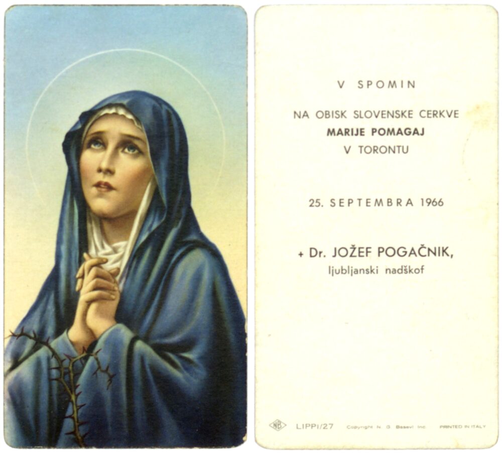 Spomin na obisk slovenske cerkve Marije Pomagaj v Torontu, 25. september 1966, ljubljanski nadškof dr. Jožef Pogačnik. Žalostna Mati Božja.