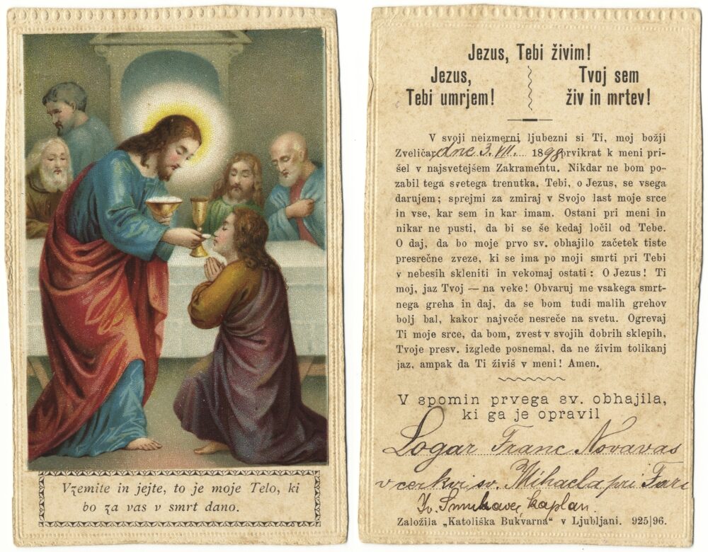 Spomin na prvo sveto obhajilo, ki ga je opravil Franc Logar v Novi vasi, 3. julija 1898, podobica je hkrati obrazec za vnos podatkov. Sveta evharistija.