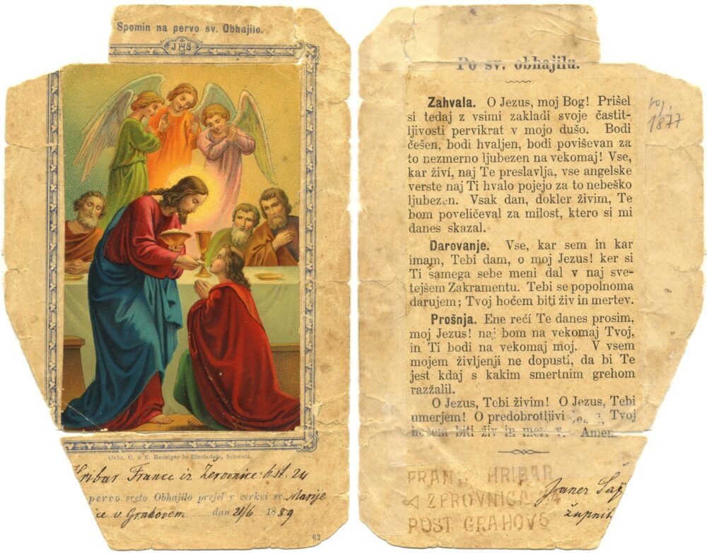Spomin na prvo sveto obhajilo Multimédiás elem 16.10.2025 22:06 közzétette Knjižnica Jožeta Udoviča Cerknica Spomin na prvo sveto obhajilo, ki ga je opravil France Hribar iz Žerovnice v Grahovem, 21. junija 1889. Sveta evharistija. Einsiedeln: Gebr. Karl & Nicolaus Benziger. Hrani MH. Slika FacebookXPinterestLinkedIn Natisni Natisni brez slik