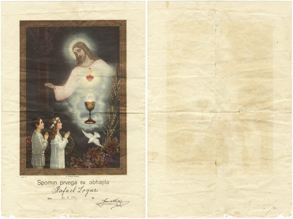 Spomin na prvo sveto obhajilo Multimédiás elem 16.10.2025 22:06 közzétette Knjižnica Jožeta Udoviča Cerknica Spomin na prvo sveto obhajilo, ki ga je opravil Rafael Logar, 28. maja 1933, podobica je hkrati obrazec za vnos podatkov. Sveta evharistija. Nemčija: KG Co.. Mere: 26 x 39 cm. Zbirka Nataše Ploskič iz Begunj pri Cerknici. Slika FacebookXPinterestLinkedIn Natisni Natisni brez slik