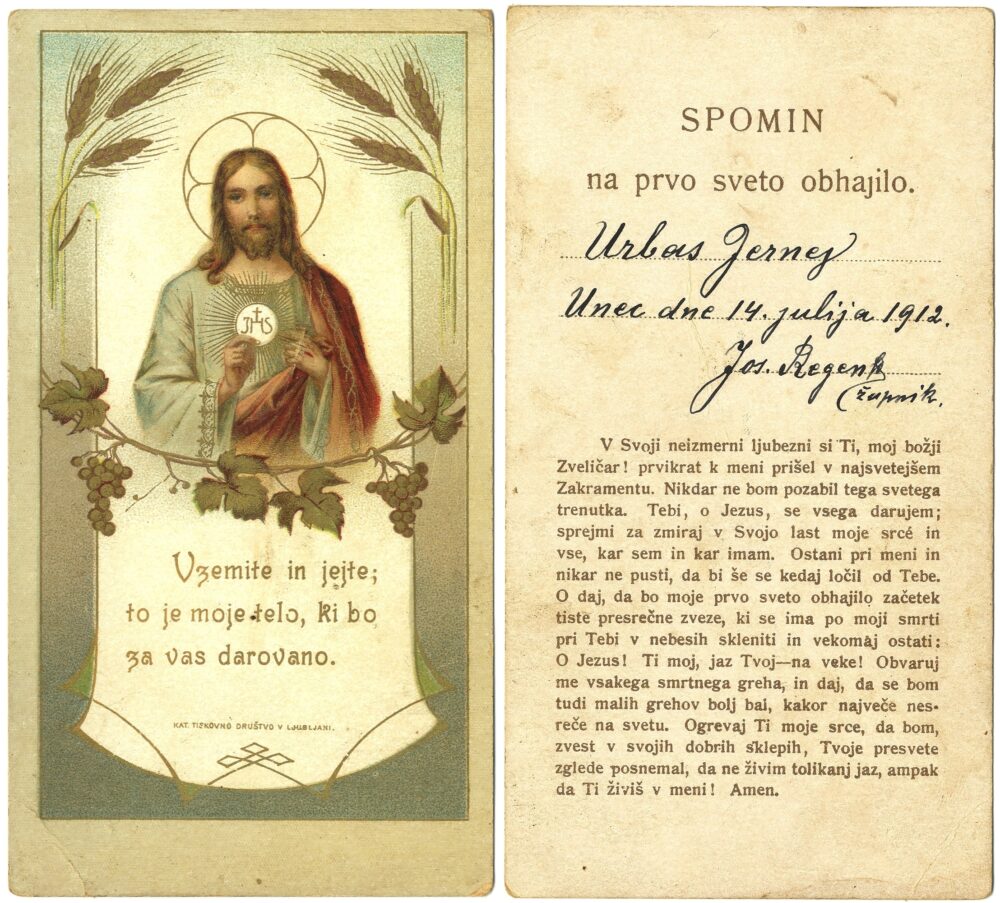 Spomin na prvo sveto obhajilo, ki ga je opravil Jernej Urbas na Uncu, 14. julija 1912, župnik Josip Regen, podobica je hkrati obrazec za vnos podatkov. Sveta evharistija.