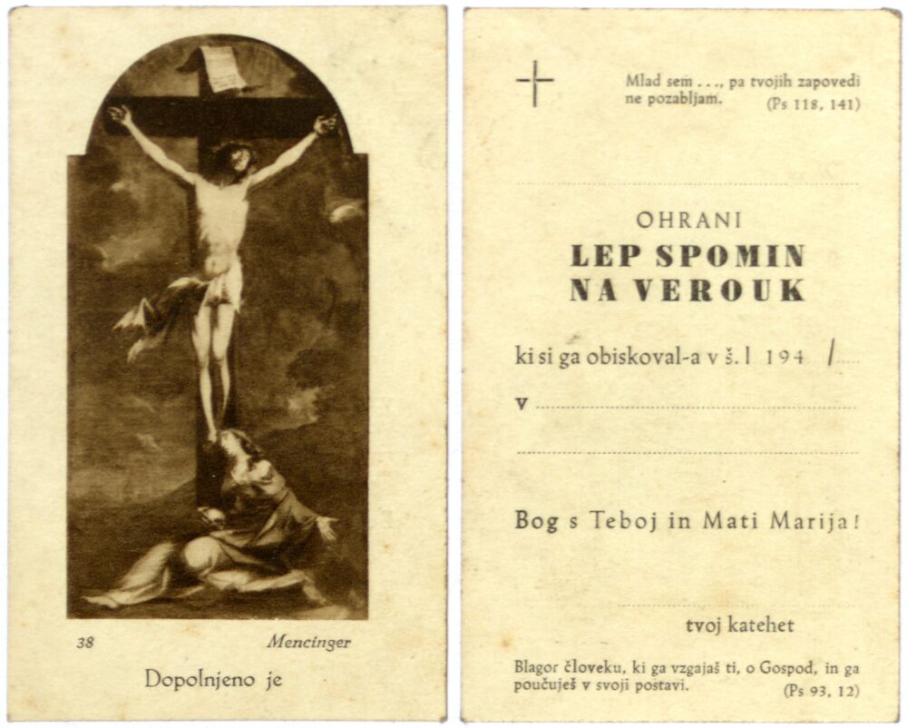 Spomin na verouk Multimédiás elem 16.10.2025 22:06 közzétette Knjižnica Jožeta Udoviča Cerknica Spomin na verouk, podobica je hkrati obrazec za vnos podatkov (prazen). Žalostna Mati pod križem (Mencinger). Mere: 5,8 x 9,5 cm. Zbirka Joži Mele iz Cerknice. Slika FacebookXPinterestLinkedIn Natisni Natisni brez slik
