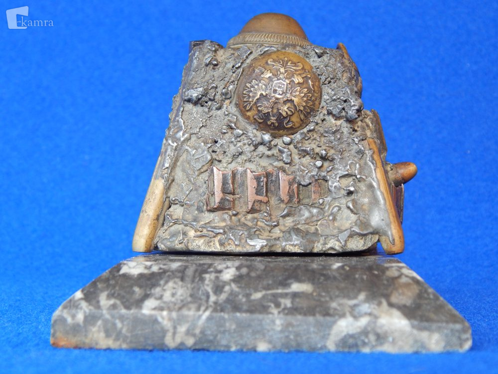 Spominek iz Velike vojne - leva stran Multimédiás elem 23.02.2024 15:46 közzétette Osrednja knjižnica Celje Spominek, ki ga je Ivan Grosek prinesel iz 1. svetovne vojne. Spominek je v obliki prisekane piramide na marmornem podstavku. Teža spominka je 1,7 kg in je večinoma iz svinca. Fotografija leve strani. Slika FacebookXPinterestLinkedIn Natisni Natisni brez slik