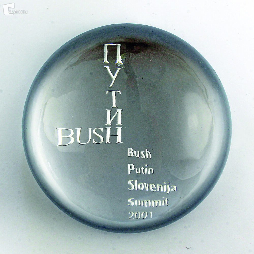 Slovenija (2001). Velik okrogel lečasto oblikovan spominski obtežilnik s široko obrušenim spodnjim robom, ki so ga izdelali v brusilnici stekla v Kozjem, ob srečanju med predsednikom ZDA Georgeom W. Bushem in ruskim predsednikom Vladimirjem Putinom, leta 2001 v Sloveniji. Podatki o srečanju, znanem tudi kot vrh Bush – Putin, so vgravirani na spodnji ravni ploskvi obtežilnika. V = 39 mm, Š = 96 mm.