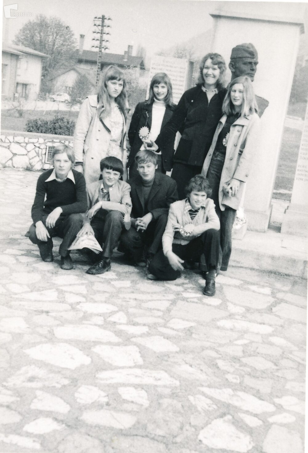 Na fotografiji stojijo od leve proti desni: Olga Šlemer, Marija (priimek ni znan), Metka Šilc, Jadranka Glavač, čepijo: Roman Erent, Marjan Zupančič, Lojze Sevšek in Jože Hočevar.