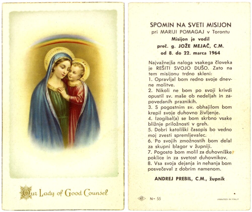 Sveti misijon pri Mariji Pomagaj v Torontu, 1964 Multimédiás elem 16.10.2025 22:06 közzétette Knjižnica Jožeta Udoviča Cerknica Sveti misijon pri Mariji Pomagaj v Torontu, 8.–22. 3. 1964. Mati dobrega svéta. Milano: NB Nino Basevi. Mere: 6,1 x 10,5 cm. Zbirka družine Kranjec iz Topola pri Begunjah. Slika FacebookXPinterestLinkedIn Natisni Natisni brez slik
