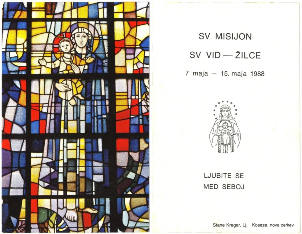 Sveti misijon pri Svetem Vidu, 1988 Multimédiás elem 16.10.2025 22:06 közzétette Knjižnica Jožeta Udoviča Cerknica Sveti misijon pri Svetem Vidu (v Žilcah), 7.‒15. maj 1988. Marija z Detetom (Stane Kregar, vitraj v župnijski cerkvi Presvetega Odrešenika v Kosezah v Ljubljani, 1974). Mere: 7 x 11 cm. Zbirka Fani Turšič iz Begunj pri Cerknici. Slika FacebookXPinterestLinkedIn Natisni Natisni brez slik