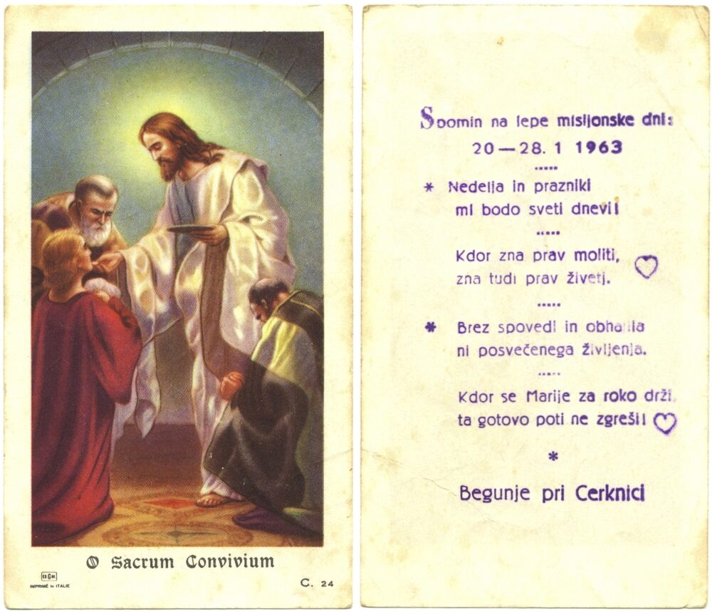 Sveti misijon v Begunjah pri Cerknici, 1963 Multimédiás elem 16.10.2025 22:06 közzétette Knjižnica Jožeta Udoviča Cerknica Sveti misijon v Begunjah pri Cerknici, 20.–28. januar 1963. Sveto obhajilo. Milano: EGIM Edizioni Grafiche Isonzo, 1947–1963. Mere: 6 x 10,5 cm. Zbirka Fani Turšič iz Begunj pri Cerknici. Slika FacebookXPinterestLinkedIn Natisni Natisni brez slik