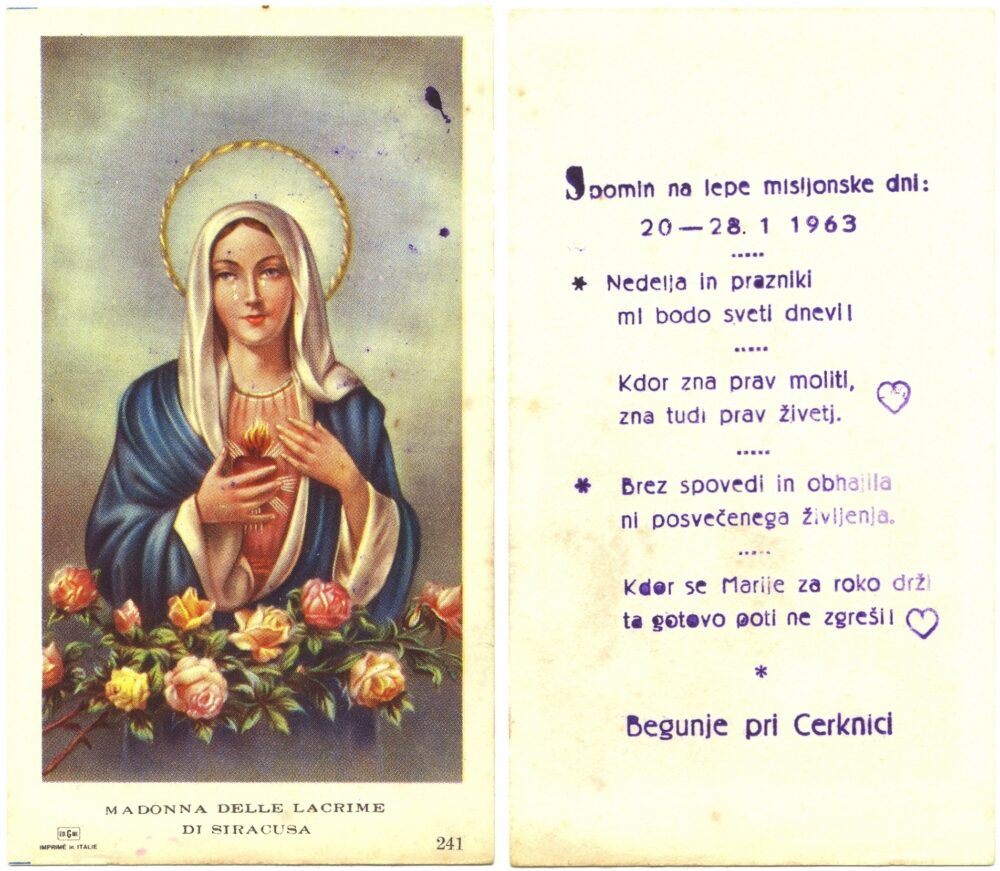 Sveti misijon v Begunjah pri Cerknici, 1963 Multimédiás elem 16.10.2025 22:06 közzétette Knjižnica Jožeta Udoviča Cerknica Sveti misijon v Begunjah pri Cerknici, 20.–28. januar 1963. Marijino brezmadežno Srce. Milano: EGIM Edizioni Grafiche Isonzo, 1947–1963. Mere: 6 x 10,4 cm. Zbirka Fani Turšič iz Begunj pri Cerknici. Slika FacebookXPinterestLinkedIn Natisni Natisni brez slik