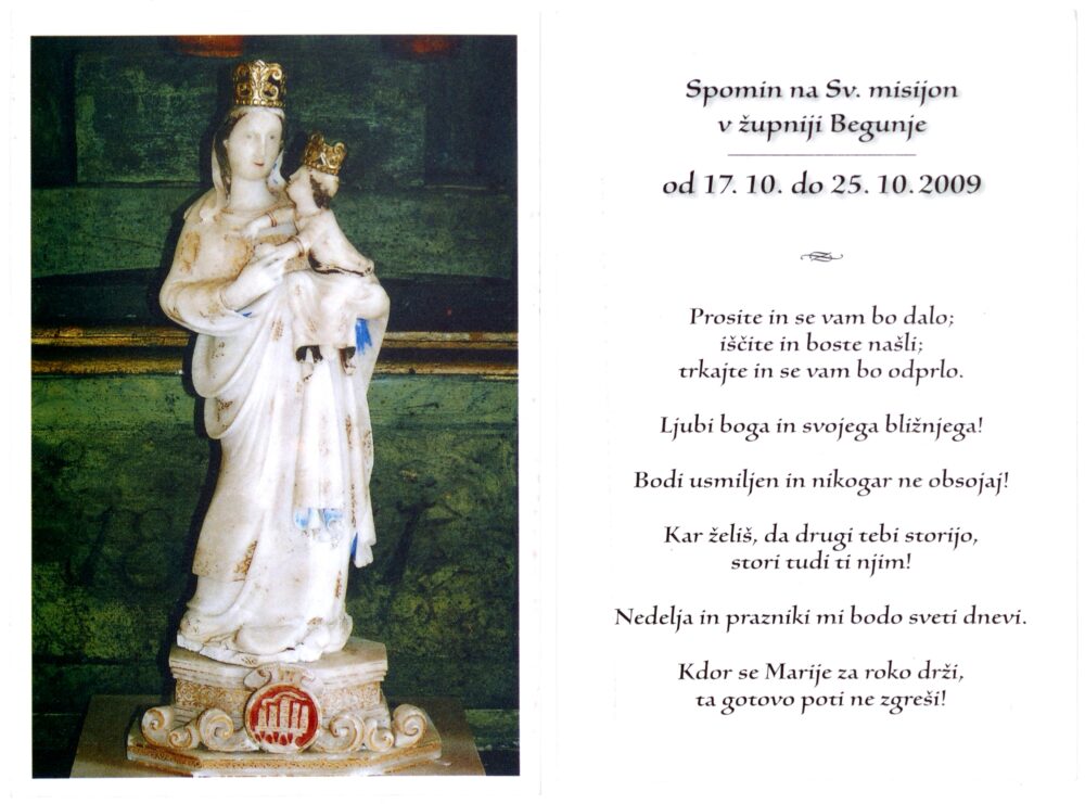 Sveti misijon v Begunjah pri Cerknici, 2009 Multimédiás elem 16.10.2025 22:06 közzétette Knjižnica Jožeta Udoviča Cerknica Sveti misijon v Begunjah pri Cerknici, 17.–25. oktober 2009. Alabastrna Marija, kapela sv. Ožbolta v Begunjah pri Cerknici. Mere: 8,3 x 12,2 cm. Zbirka družine Kranjec iz Topola pri Begunjah. Slika FacebookXPinterestLinkedIn Natisni Natisni brez slik