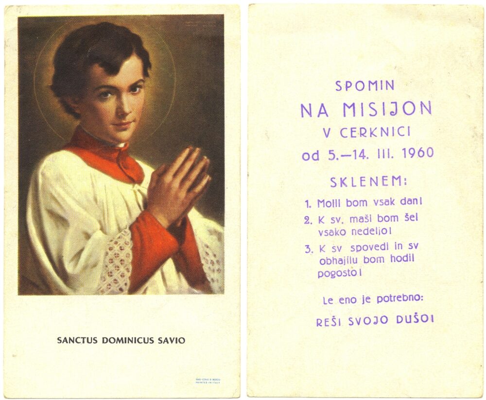 Sveti misijon v Cerknici, 1960 Multimédiás elem 16.10.2025 22:06 közzétette Knjižnica Jožeta Udoviča Cerknica Sveti misijon v Cerknici, 5.–14. marec 1960. Sv. Dominik Savio, Sanctus Dominicus Savio. Italija: ISAG-Colle D. Bosco. Mere: 5 x 8 cm. Zbirka družine Otoničar iz Martinjaka. Slika FacebookXPinterestLinkedIn Natisni Natisni brez slik
