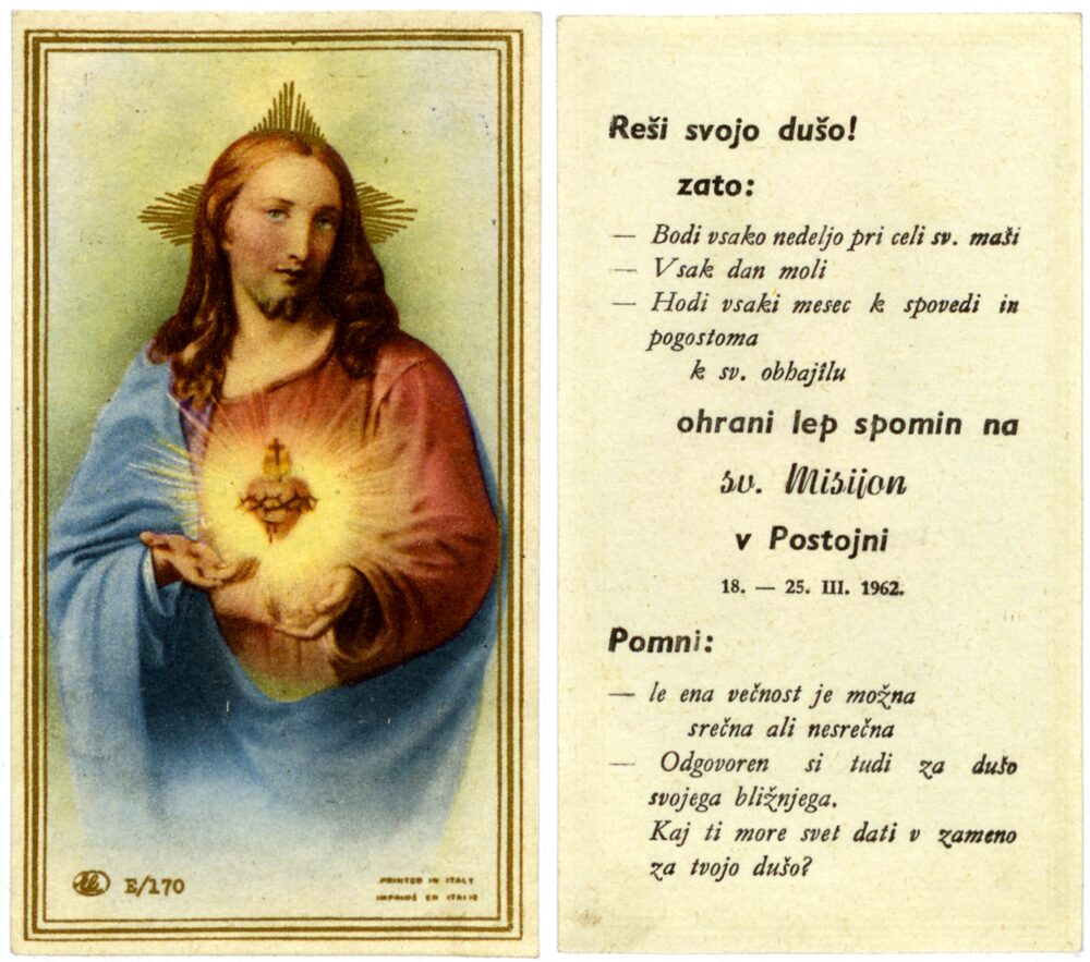 Sveti misijon v Postojni, 1962 Multimédiás elem 16.10.2025 22:06 közzétette Knjižnica Jožeta Udoviča Cerknica Sveti misijon v Postojni, 18.–25. marec 1962. Presveto Srce Jezusovo. Milano: Eb Enrico Beretta, 1928–1992. Mere: 5,8 x 10,3 cm. Zbirka Joži Mele iz Cerknice. Slika FacebookXPinterestLinkedIn Natisni Natisni brez slik