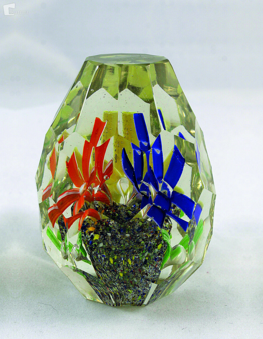 Češka (pred letom 1940). Visok obtežilnik jajčaste oblike s petimi nivoji fasetnih polj, od katerih najvišje vodoravno polje predstavlja desetkotno ogledno okno. Glavni motiv tvorijo trije cvetovi modre, bele in oranžne barve, izdelani iz širokih steklenih trakov. Ekspandirani mehurčki se iz sredine cvetov podaljšujejo v kratke peclje, ki segajo v pisano drobnozrnato podlago v obliki visokega cvetličnega lončka. Iz strani lončka izraščajo trije zeleni listom podobni izrastki s središčnimi mehurčki. Baza je desetkotna, ravna in grobo brušena. V = 94 mm, Š = 71 mm.