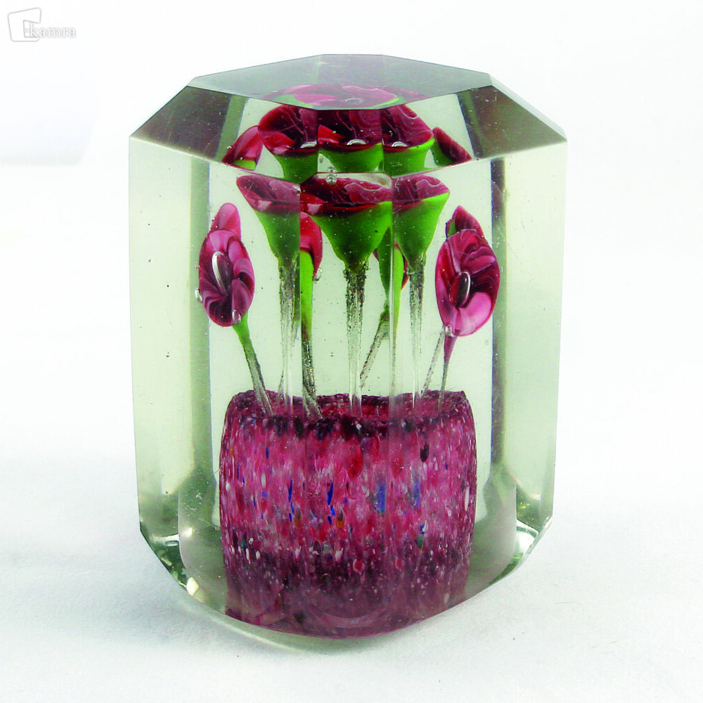 Češka (1920 – 1930). Visok pravokotni obtežilnik s poševno posnetimi robovi. Osrednji cvet in štirje stranski cvetovi so enako veliki in iz prelivajočega rdečega in belega stekla. Čašni deli cvetov in zgornji deli pecljev so zeleni, navzdol pa se nadaljujejo kot ozki mehurčki, vse do podlage, ki ima obliko cvetličnega lončka. Podlaga je pretežno iz delcev rdeče barve. Baza obtežilnika je okrogla in polirana. V = 86 mm, Š = 59 mm.