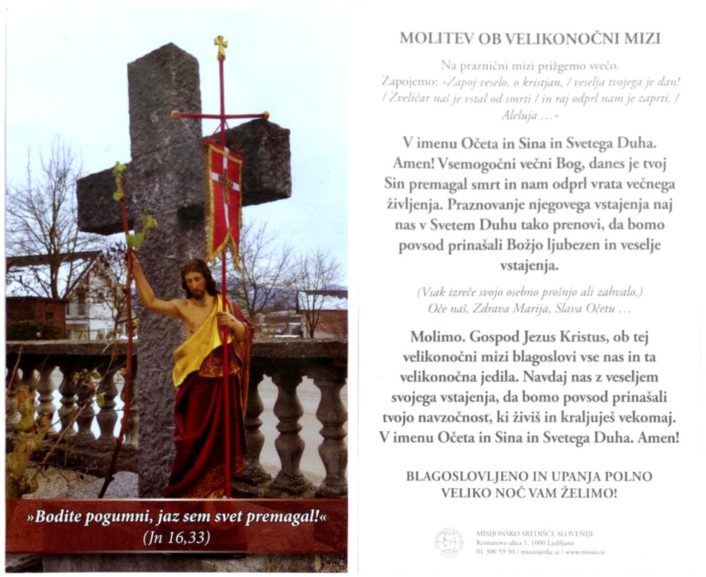 Vstali Kristus Multimédiás elem 16.10.2025 22:05 közzétette Knjižnica Jožeta Udoviča Cerknica Vstali Kristus. Molitev ob velikonočni mizi in velikonočno voščilo. Ljubljana: Misijonsko središče Slovenije. Mere: 8 x 13 cm. Zbirka družine Kranjec iz Topola pri Begunjah. Slika FacebookXPinterestLinkedIn Natisni Natisni brez slik