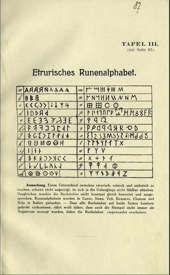 Etruščanski črkopis Multimédiás elem 16.04.2018 11:33 közzétette Knjižnica Ivana Potrča Ptuj Žunkoviča je pritegovala domnevna zveza med etrurščino in slovenščino. Na sliki: stran z etruščanskim črkopisom (rune) iz knjige Slavische Runen – Denkmäler (1915). Slika FacebookXPinterestLinkedIn Natisni Natisni brez slik