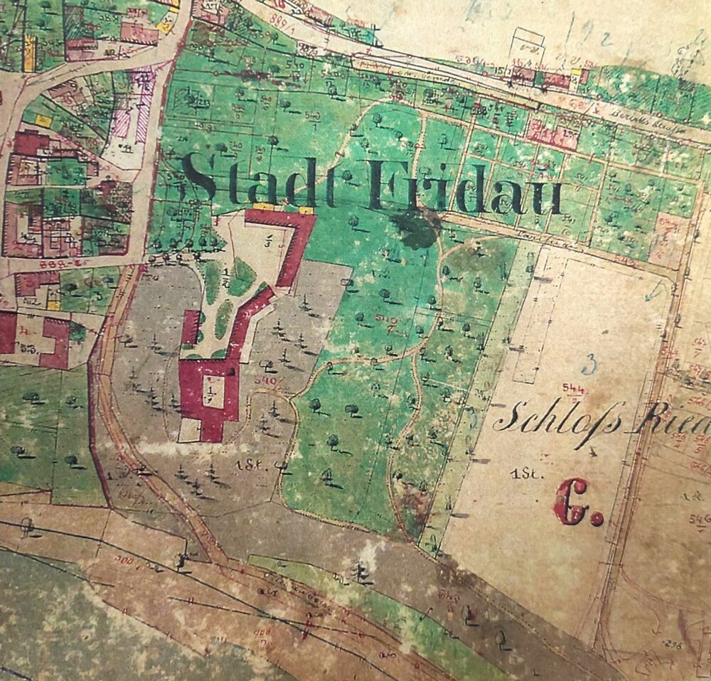 Kataster iz leta 1875 prikazuje, da je bila na območju gradu zasnovana ureditev v krajinskem slogu z značilnim organskim potekom poti. Na območju pred gradom je velika peščena površina, na kateri so razporejene večje zelene površine eliptične oblike. Lepo viden je tudi krajši dvostranski drevored, ki vodi od glavne ceste proti gospodarskemu objektu (grajski pristavi). Območje grajskega hriba je močno poraščeno, glede na simbole gre za gost nasad iglavcev.