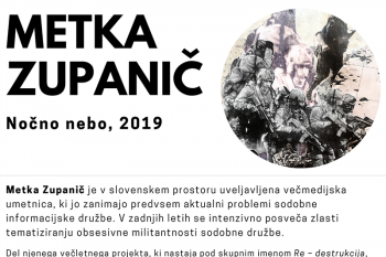 Metka Zupanič je uveljavljena večmedijska umetnica, ki jo zanimajo predvsem aktualni problemi moderne informacijske družbe. V zadnjih letih se intenzivno posveča zlasti tematiziranju obsesivne militantnosti sodobne družbe.