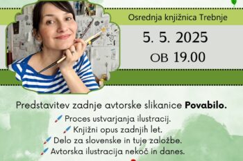 Na pogovornem večeru nam bo predstavila svoj proces ustvarjanja ilustracij, knjižni in ilustratorski opus zadnjih let, zadnjo avtorsko slikanico Povabilo, delo za slovenske in tuje založbe ter svoje mnenje o avtorski ilustraciji nekoč in danes. Pogovor bo vodila Patricija Tratar.