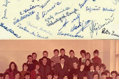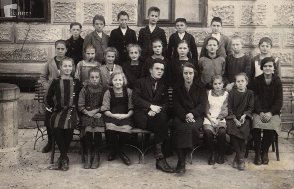 7. in 8. razred OŠ Metlika pred šolsko zgradbo na Partizanskem trgu. Drugi od leve v zgornji vrsti je Josip Kopinič (r. 18. 2. 1911, Radoviči – u. 24. 5. 1997, Ljubljana), ki je rešil Tita, da ga Stalin ni likvidiral. Bil je znan pod vzdevkom Vazduh. Bil je obveščevalec Stalina in Kominterne na Balkanu. Peti od leve v zgornji vrsti je Janko Bračika (r. 1911). Fotografija je nastala leta 1925. V sredini spodaj sedi učitelj Leopold Morela.