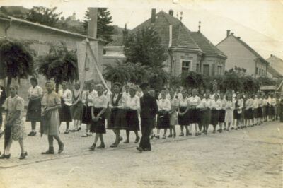 Povorka po Partizanski ulici (sedanja Glavna ulica) ob končanju 2. svetovne vojne maja 1945. V ozadju slike je sedanja knjižnica. Moja takrat 17-letna mama Kelenc Terezija iz Gaberja pri Lendavi  je druga levo od redarja.