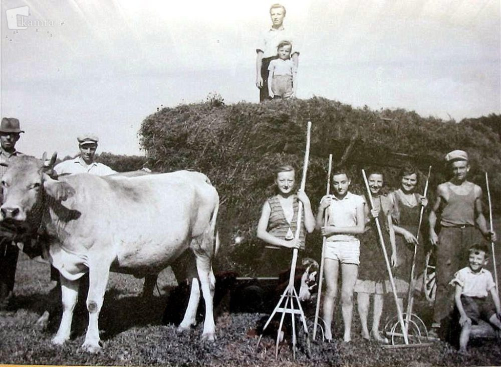 Slika prikazuje spravljanje krme. Na voz se je po strogih pravilih nakladalo ročno z vilami, da pri prevozu seno ni padlo z voza. Pri spravljanju sena so uporabljali lesene vile in grablje. Ker so bili doma na hribu so za vleko voza uporabljali vole. Ti so bili počasnejši, a mnogo močnejši od konjev. Na vozu je stric Vinko Kovačič, ki je imel nalogo, da je pri nakladanju hodil po senu in ga na ta način tlačil, da so na voz spravili čim več sena. Skrajno levo je stari oče, Jožek Kovačič, zraven njega sin Ivan Kovačič. Oče Jože (Pepič) Kovačič je na fotografiji skrajno desno, 2. z desne je mama Pepca Kovačič. Ostalo so na sliki sosedje.