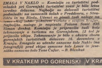 Podmladek Turističnega društva Naklo je dve leti zapored (1979, 1980) osvojil prvo mesto v tekmovanju Gorenjske turistične zveze za vsestransko dejavnost in premagal vse šole s poklicnimi mentorji – učitelji.