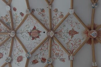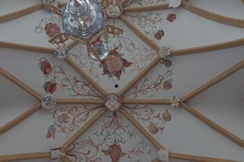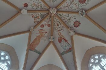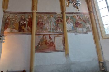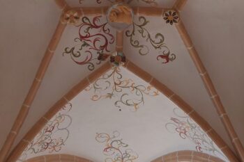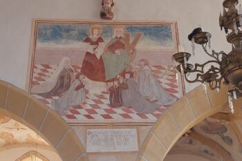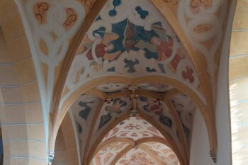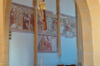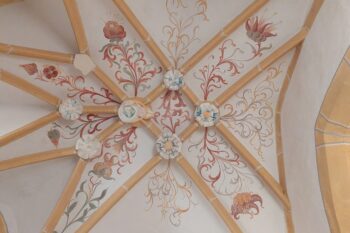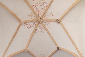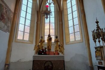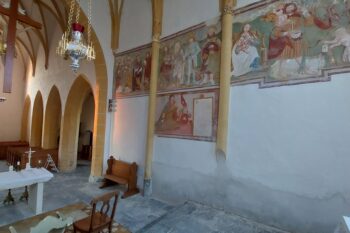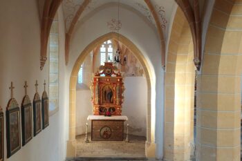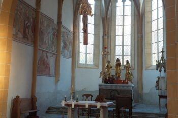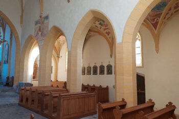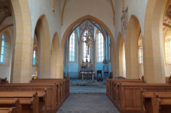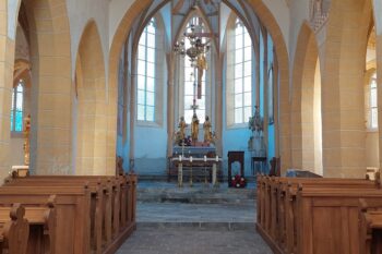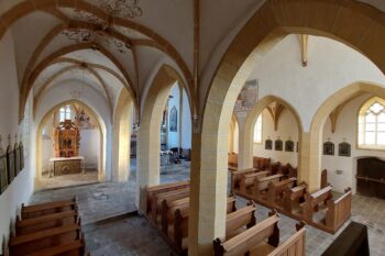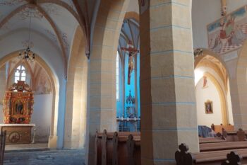 Cerkev je triladijska in se skozi tri slavoločne loke odpira v tri samostojne prezbiterije – oltarne zaključke. Ladijski del, v tlorisu oblikovan kot kvadrat, je z mogočnimi osemkotnimi slopi razdeljen v širšo glavno in ožji stranski ladji.
