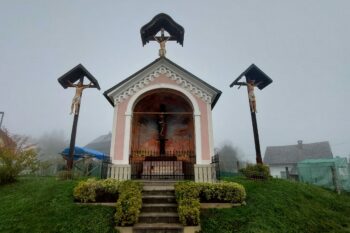 Kapelica Pri treh križih je stavba z dvokapno streho, pod katero je neoromanski friz. Že ob gradnji v 18. stol. je bila kapelica poslikana in kasneje na novo preslikana. V letu 2008 in 2009 so potekala restavratorska dela, kapelico so na novo poslikali s freskami. Na zahodni zunanji steni je motiv sv. Petra, na severni je Kristus v oblakih, na vzhodni pa sv. Pavel. Notranjščino kapelice krasijo freske s prizori Kristusovega trpljenja, ki so prvotno nastale v 2. pol. 19.stol., sredi kapele pa je kip Marije iz 1. pol. 18. stol. (v kapelici je kopija, original je v Turenčku).