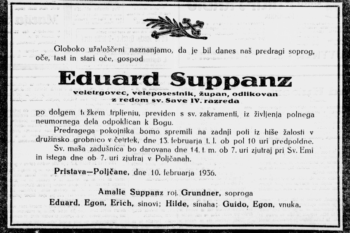 Trgovski list je 12. septembra 1936, dobrega pol leta po smrti Eduarda, objavil vpis novega podjetja v trgovinski register z imenom Ed.Suppanz, družba z. o. z., trgovina na debelo in drobno z vsem blagom in uvozna in izvozna trgovina. Nova družba je imela tri poslovodje: Eduard Suppanz v Peklu 16 (to je bil del Poljčan ob južni železnici), Egon Suppanz v Pristavi 19 (vila Suppanz) in Erih Suppanz v Pristavi 26 (stanovanjsko-poslovna stavba Suppanz).