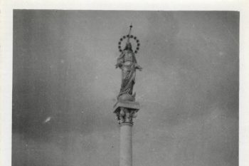 Na visokem stebru iz rdečkastega marmorja, ki ga je leta 1857 oblikoval kamnosek iz Mengša Tomaž Sirolli je vklesan napis: Mariji Devici brez madeža izvirnega greha spočeti. Postavil Mengeš 1857.