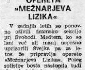 V 50-h in 60-h letih 20. stoletje so žalsko Svobodo pestile različne težave in problemi. Kljub vsem preprekam so uspeli pripraviti in odigrati kar nekaj iger in operet. V začetku 70-h let so uspešno pripravili opereto v treh dejanjih Mežnarjeva Lizika, ki jo je napisal Josip Stech leta 1939, za slovenske odre pa je glasbo in besedilo napisal Jaka Špicar.