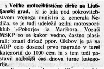 Avtor B. A. K. se je dotaknil tudi dejstva, da so nekateri svoje odlično znanje pokazali šele v vožnji izven tekme oziroma konkurence. Ivan (Janko) Šiška je tako na svojem BMW 500 ccm pokazal, da se da doseči boljši čas, toda po mnenju pisca je potrebno pravo znanje pokazati v konkurenci, »ker je res, da se slednjič marsikaj posreči, če se nekajkrat poskusi. Iz vsega tega bi se dalo sklepati, da našim vozačem primanjkuje treninga. Sicer smo pa sploh proti temu, da se dovolijo starti izven konkurence, ki jih zaradi različnih psihičnih razpoloženj in napetosti ne moremo primerjati z onimi v konkurenci, obenem pa ustvarijo slabo moralo med dirkači v konkurenci, ki se jim tako omalovažujejo njihovi uspehi. Potrebno bi bilo, da bi bil na startu večji red in bi bilo potem manj vseh nepotrebnih nesporazumov. Če je dan znak za start, se starta, če tekmovalec ni startal, je sam kriv, nikakor pa ne gre, da se starti ponavljajo.«