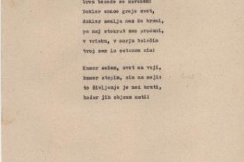 Pozneje tematsko ozadje pesmi pogosto predstavlja vojna in njene posledice, pri čemer pesniku poezija predstavlja umik (iz spremne besede k rokopisni zbirki Besede v samoti iz septembra 1943): »V dneh, ko se lomijo svetovi, se človek, ki ni zapleten v neposredno borbo, umakne v samoto. Kakor mati v času pričakovanja svoj plod, tako je dolžan gojiti in negovati vrednote vseh spoznanj in dognanj, ki se mu utrinjajo v samoti. Na razvalinah preteklosti bo bližnja bodočnost skrbno in ljubeče paberkovala za vsemi tistimi zakladi človeškega duha, ki so danes v bolečinah novega rojstva pregaženi in poteptani. Življenje je namreč večna povezanost. In kakor se morda temu upiramo, nosimo vsi skupaj in vsak posebej v najglobljih temeljih svojega bistva dobre in slabe kali svojih prednikov. Od tega, kako te kali oblikujemo in jih skušamo poplemenititi, zavisi življenjska vrednost posameznikov in celih pokolenj, ki dajejo [poslednjim] dobam svojski navdih.«