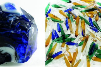 Stekleni drobci, drobir, granulat (bits) so pogost dekorativni del post-klasičnih obtežilnikov. Pridobili so jih z nenadnim ohlajanjem vročega stekla v hladni vodi. Vnaprej ogrete raznobarvne steklene drobce so nato razprostrli po kovinski plošči za oblikovanje in jih z valjanjem ter vtiskovanjem prenesli na nabor žarečega plastičnega stekla na steklarski palici. Pri nekaterih obtežilnikih sta v podlagi pod glavnim motivom prisotna tudi steklen prah in kremenčev pesek.