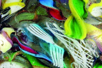 Umešani obtežilniki (scrambled paperweight) so pogosti tako med klasičnimi kot neo-klasičnimi obtežilniki. Vsebujejo različne odlomke millefiori paličic, belih ali obarvanih trakov, čipk in raznih drugih drobnih okrasnih elementov. Večinoma so jih steklarji izdelovali med prekinitvami dela ali po končanem delovniku, zato se jih je prijelo tudi ime end of day paperweights. Iz naših glažut in steklarn niso znani. (sl. 6.24. Detajl umešanega obtežilnika)