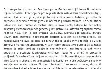 Strokovna komisija, ki jo je imenovala direktorica Mariborske knjižnice Dragica Turjak, v sestavi dr. Andreja Erdlen, Jasna Mlakar in mag. Nina Hriberšek Vuk se je po koncu natečaja soočila z zelo težko nalogo izbrati najboljše tri, saj je vsaka zgodba mala mojstrovina in pomemben kamenček v mozaiku naše domoznanske zbirke. Članice komisije smo se nazadnje zedinile, da prejme 1. nagrado zgodba Kruh za dušo avtorice Ksenije Šešerko, 2. nagrado zgodba Po stopnicah avtobusa do svobode avtorice Lee Dvoršak in 3. nagrado zgodba Rimljanka avtorice Juše Knez-Riedl. Komisija se je prav tako odločila podeliti še dve nagradi, in sicer članoma VDC Sožitje Maribor Timoteju Brezniku za pripoved Zgodba iz moje knjižnice ter Adrijani Morovič za zgodbo Ambulanta za knjige. Vse prispele pripovedi skupaj z obrazložitvami nagrajenih zgodb pa objavljamo na Kamri in vam jih ponujamo v branje.