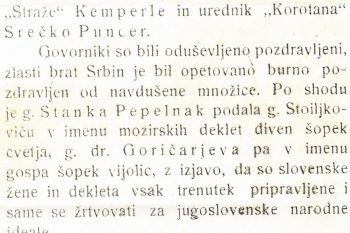 Govorniki so bili oduševljeno pozdravljeni, zlasti brat Srbin je bil opetovano burno pozdravljen od navdušene množice. Po shodu je gospa Stanka Pepelnak predala Stojilkoviću diven šopek cvetja, gospa dr. Goričarjeva pa v imenu gospa Mozirja, šopek vijolic, z izjavo, da so slovenske žene in dekleta vsak trenutek pripravljene i same se žrtvovati za jugoslovanske narodne ideale. Shod je bil odlično obiskan, zlasti so se ga v velikem številu udeležili goriški begunci. Na tem shodu je bila sprejeta resolucija poslana na kraljevsko vlado SHS v Beogradu.«