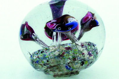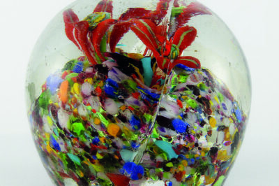 Primer nedokončanega kroglastega obtežilnika s petimi majhnimi deformiranimi cvetovi iz raznobarvnega stekla 15.12.2025 Osrednja knjižnica Celje 0 ogledov