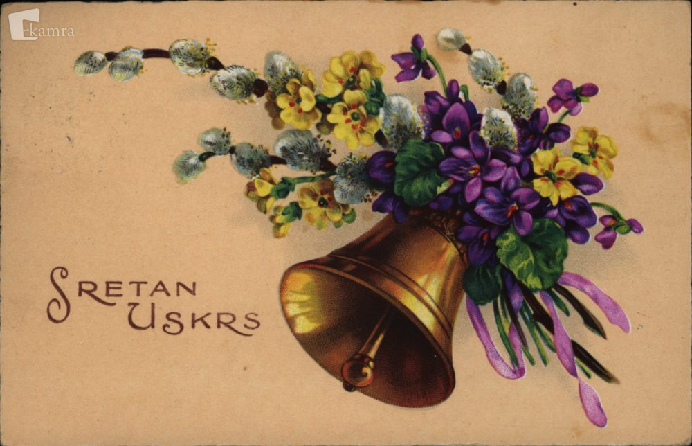 Voščilnica je narisana in prikazuje cvetlični aranžma z zvončkom. V šopku so vijolice, trobentice in mačice z vijoličastim trakom. Zvonček je zlate barve. Na levi strani je napis Sretan Uskrs.