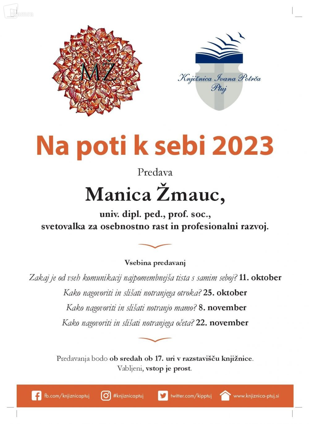 Cikel predavanj Na poti k sebi Elemento multimediale 19.09.2023 11:25 pubblicato da Knjižnica Ivana Potrča Ptuj Slika FacebookXPinterestLinkedIn Natisni Natisni brez slik