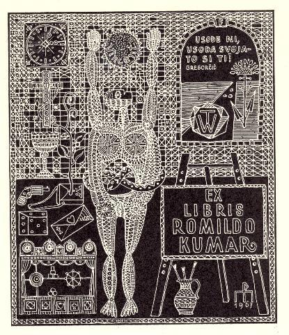 »Bogato vsebinsko tematiko prikazuje ekslibris za Romilda Kumarja, čeprav je kompozicijsko preveč nasičen. Sestoji nekako iz dveh delov: temne spodnje polovice, ki naj bi označevala težo in materialno življenje, ter svetlejše zgornje polovice kot sveta duha. Ekslibris ima moto Gregorčičevih poezij.«