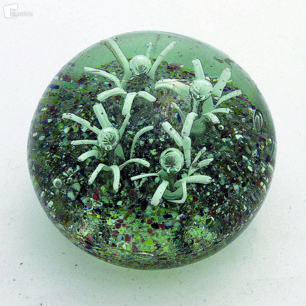 Rakovec pri Vitanju (pred letom 1874). Horizontalno ovalen obtežilnik iz rahlo zelenkastega stekla, s štirimi zelo površno izdelanimi cvetovi iz ozkih trakov belega stekla. Cvetni listi so ob ekspandiranem mehurčku, ki se podaljšuje v cvetni pecelj močno upognjeni navzdol. Blazina je iz raznobarvnih zelo drobnih enakomerno porazdeljenih steklenih drobcev in steklenega prahu. Baza obtežilnika, z vidno sledjo odloma od steklarske palice, je ravna in polirana. V = 75 mm, Š = 77 mm.