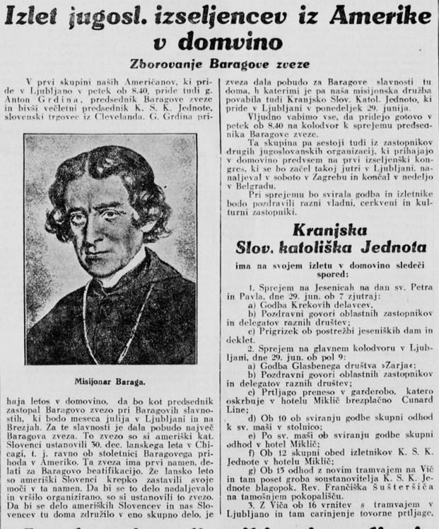Julija 1931 so se v Ljubljani in na Brezjah na Gorenjskem med številnim obiskom ameriških izseljencev odvile tudi Baragove slavnosti. Med izseljenci je junija v Slovenijo prispel tudi Anton Grdina, slovenski trgovec iz Clevelanda ter predsednik Baragove zveze in nekdanji večletni predsednik Kranjsko-slovenske katoliške jednote. Za te slavnosti je dala pobudo Baragova zveza, ki so jo ameriški katoliški Slovenci ustanovili 30. 12. 1930 v Čikagu (Chicagu). Ta zveza si je prizadevala doseči Baragovo beatifikacijo. Irenej Friderik Baraga (1797-1868) je bil prvi slovenski misijonar in škof v Ameriki.