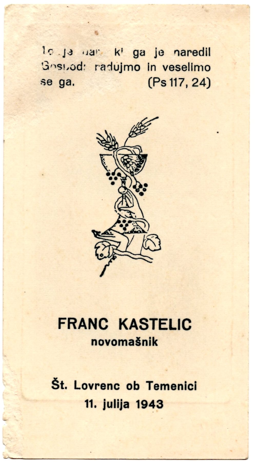 Jezus Kristus s križem, novomašnik Franc Kastelic Elemento multimediale 07.09.2021 10:46 pubblicato da Knjižnica Pavla Golie Trebnje 82A: Jezus Kristus, ki nosi križ in pod njim so svetilka, trnje, grozdje, knjiga, ogrlica s križem in kelih. AR (znak) Dep. 25 Natisnjeno v Italiji. 82B: Novomašnik Franc Kastelic, Št. Lovrenc ob Temenici, 11. julij 1943. Slika Hrbtna stran FacebookXPinterestLinkedIn Natisni Natisni brez slik