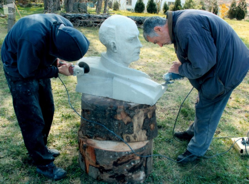 Odstranjevanje plasti prepleska. Restavratorska dela opravlja akademski kipar Marko A. Kovačič s sodelavcem.
