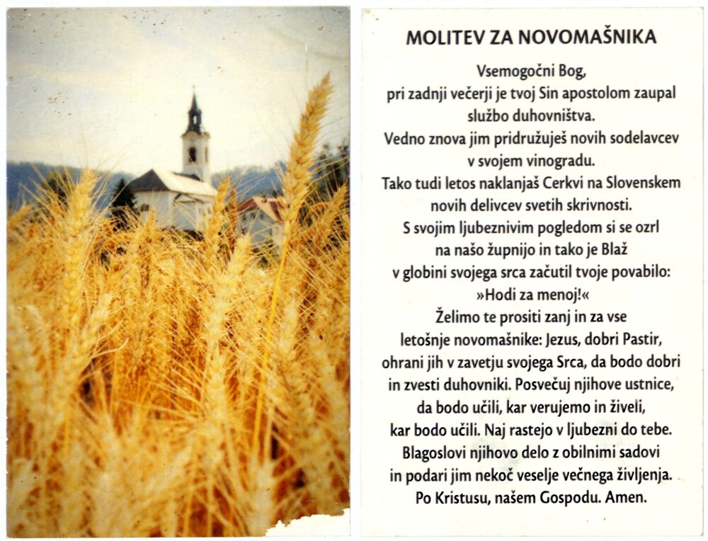 Klasje in cerkev Elemento multimediale 16.10.2025 22:05 pubblicato da Knjižnica Jožeta Udoviča Cerknica Klasje in cerkev. Molitev za novomašnika. Mere: 6,9 x 10,6 cm. Zbirka Joži Mele iz Cerknice. Slika FacebookXPinterestLinkedIn Natisni Natisni brez slik
